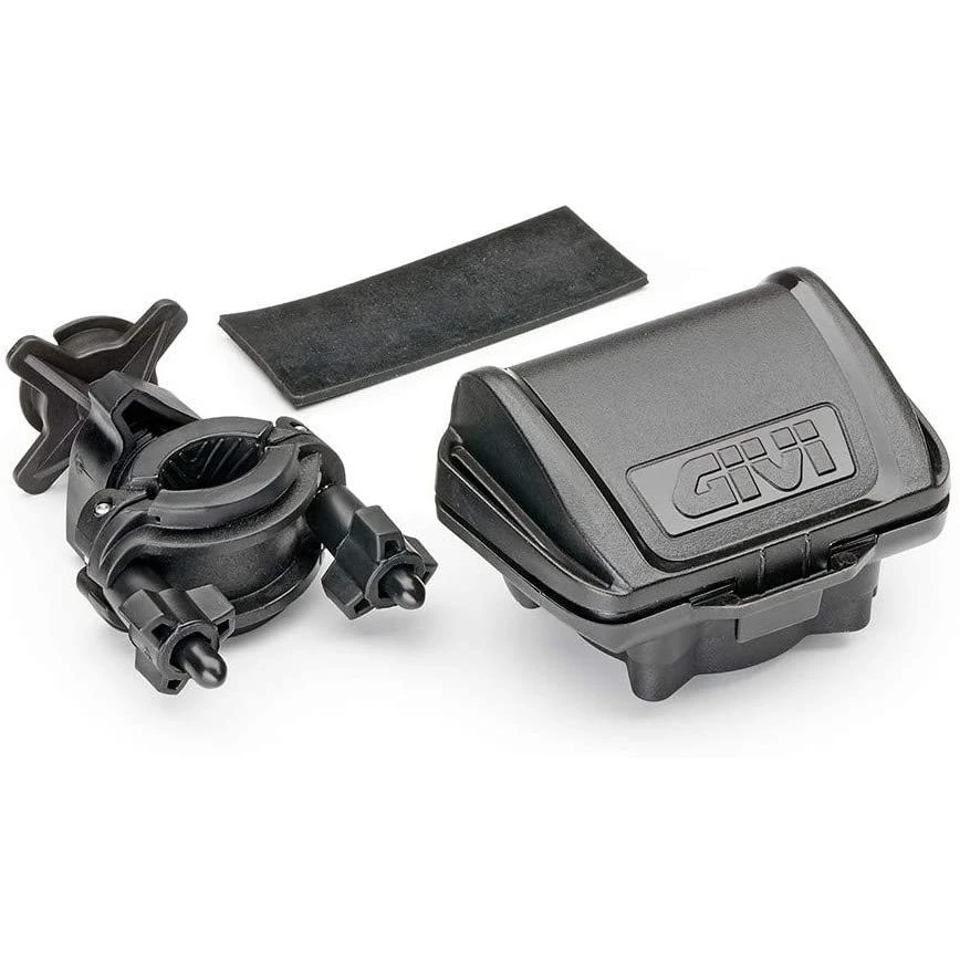 Universelles Gehäuse für europäische Mautgeräte für Autobahnen, ausgestattet mit einem universellen Kit zur Befestigung an Lenkern, Querstangen und Spiegeln.
