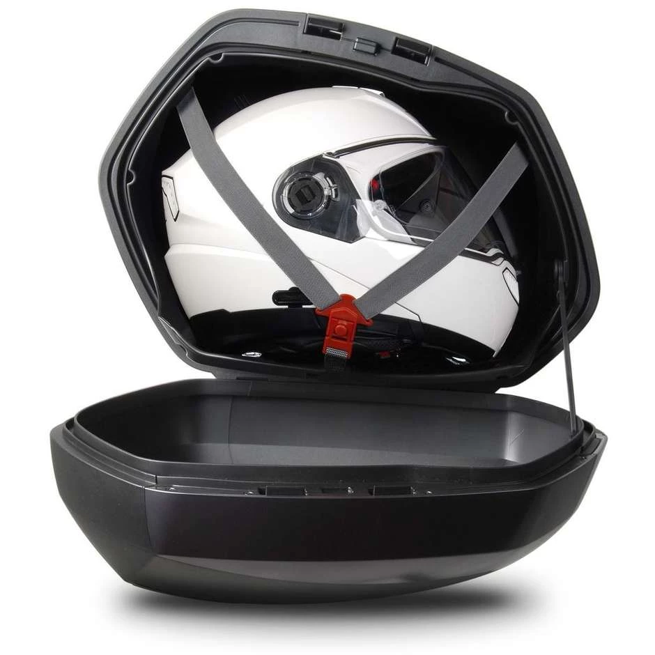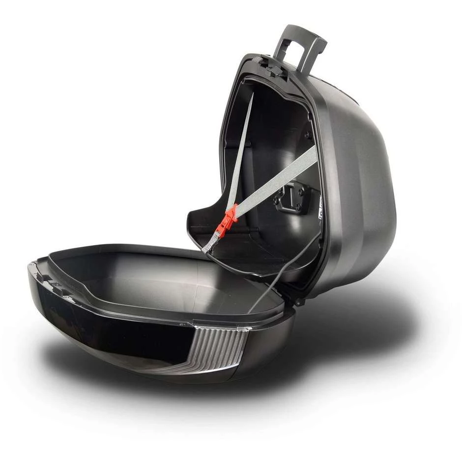 - Die Sicherheit des Griffverriegelungssystems ermöglicht eine Doppelverriegelung. Zum einen wird der Kofferraum am Motorrad befestigt und zum anderen der Kofferraum selbst geschlossen