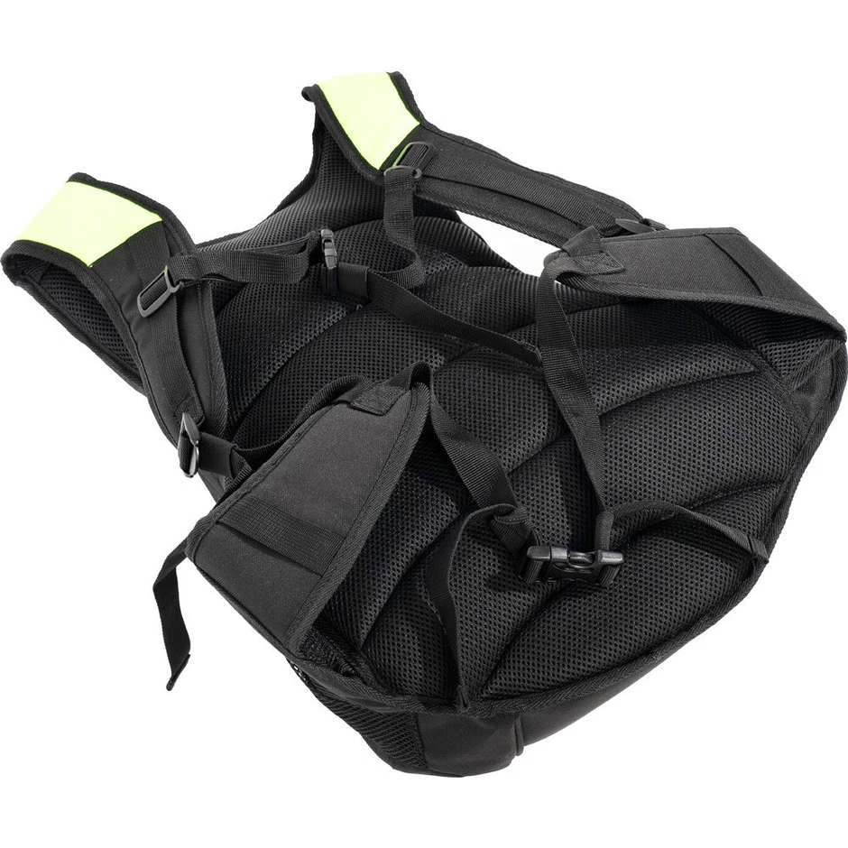 Dieser Rucksack besteht aus Polyester, verstellbaren Schultergurten mit Riemen an Brust und Taille, dickem Schwamm für besten Komfort und reflektierendem Material für bessere Sichtbarkeit, einziehbarer Helmtasche und kleinen bequemen und funktionellen Taschen.